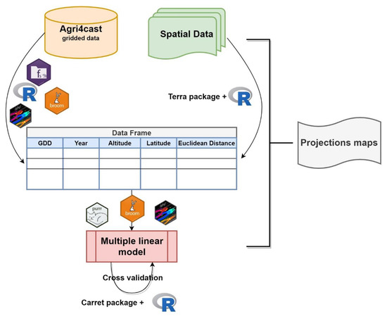 where GDD represents the value of the GDD units (dependent variable) at a certain point; b0 is constant, and b1 to b4 are the coefficients of each independent variable from every multiple regression. alt is the altitude (m), lat is the latitude (degrees), dist is the distance from the shoreline (km), and time is the number of the year. So, the equation contains time-invariant factors such as altitude, latitude, and the shoreline distance and the year (time-variant) factor, to achieve spatiotemporal, inter-and extrapolation. In order to assess the accuracy of the regression model, a k(10)-fold cross-validation test using the Caret R package was performed [69].