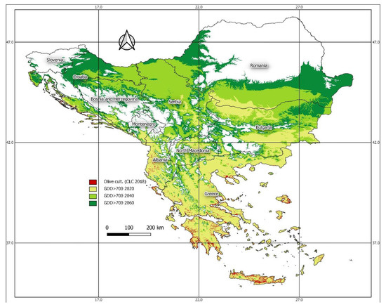 To illustrate the spatiotemporal distribution of the GDD in the Balkans area according to olive tree requirements for full blooming, the above MLR model for three time periods (2020, 2040, 2060) was implemented. In Figure 3, the light green color for the year 2020 is covering the total area with GDD above the threshold level of 700. The green and dark green colors for the years 2040 and 2060, respectively, are depicting the additional areas with GDD above the level of 700. Moreover, in the map are presented the regions where was established the olive tree cultivation according to Corine land cover in 2018. As it is presented, the GDD in 2020 allows the cultivation of olive tree in the southern part of the Balkans, covering an area from Greece to the northern borders of Bulgaria in the valley of Danube. The only regions which are excluded by this criterion are the higher mountainous areas. At this point, it must be pinpointed that there are several climatic restrictions, such as early or late frosts or extremely high temperatures, that make the cultivation of the olive tree inevitable, which it is not taken into account in this framework. The expansion of the areas which address the criterion of 700 GDD for the year 2040 is negligible in the southern part of the studied area. There is only a small addition in the high-altitude zone. The region where is recorded a broader expansion is in the northern part of the Balkans, especially in Northern Serbia and in the south of Romania. The time projection to the year 2060 indicates a further expansion of areas and fulfils the criterion of 700 GDD to the northern part of the Balkans. So, the zone of olive tree cultivation is covering the northern part of Croatian (and the neighboring part of Slovenia) along with a vast sector in Central Romania.