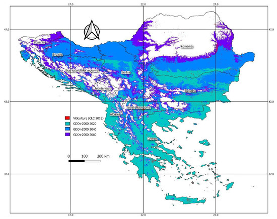 The following map (Figure 4) illustrates the areas which fulfil the criterion of 2000 GDD for the May to October period. As presented for the year 2020, all the southern part of the Balkans is suitable for viticulture, considering GDD. More specifically, the coastal zone of Albania, Montenegro, Croatia, and Slovenia, along with an extended part of Bulgaria and Southern Romania and the plains of North Macedonia and Serbia are suitable for viticulture.