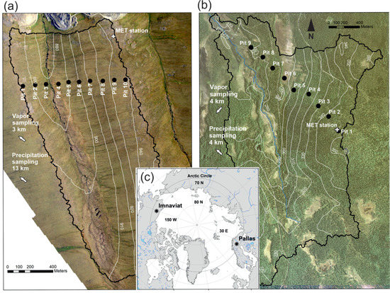 Locations of snowpit sampling, meteorological stations, and indication of precipitation and vapor sampling locations in the (a) Imnavait and (b) Pallas study sites. Subfigure (c) shows the site locations at the opposite sites of the Arctic.