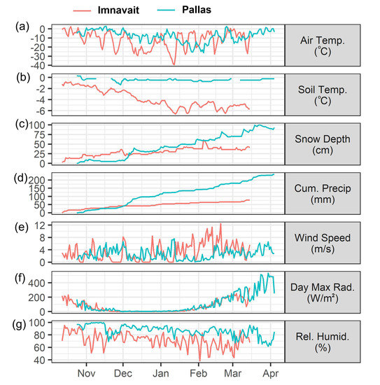 Key meteorological variables for daily (a) mean air temperature, (b) mean soil temperature, (c) maximum snow depth, (d) cumulative precipitation, (e) mean wind speed, (f) maximum short wave radiation (g) mean relative humidity for winter 2018–2019 at the study sites, with Imnavait in red and Pallas in blue.