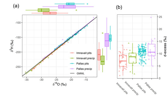 (a) Dual isotope plot with side panel boxplots and regression lines, and (b) boxplots for d-excess values for snow pit and precipitation samples for Imnavait and Pallas. Note how water line plots depict the generally colder conditions in North Alaska and the lower isotope composition compared to those at Pallas. Slopes and standard errors for regression equations are Imnavait pits: 8.14 ± 0.14, Imnavait precip: 8.13 ± 0.28, Pallas pits: 7.46 ± 0.07, Pallas precip: 7.95 ± 0.28.