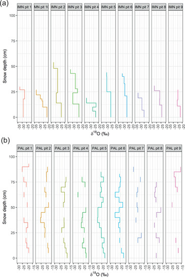 δ18O profiles for individual snowpits at (a) Imnavait and (b) Pallas. Zero on the y-axis represents the base of the snowpack.