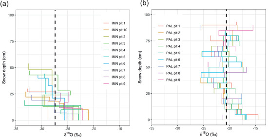 Snow δ18O and profiles for the sampled snowpits at (a) Imnavait and (b) Pallas. δ18O value in each sample is represented by a vertical line spanning the sampling depth. The dashed line indicates the mean δ18O value of all samples.