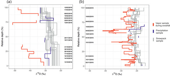 Accumulated vapor δ18O composition (red) during days with snowfall and accumulated precipitation δ18O profiles (blue) superimposed on the snowpack δ18O profiles (gray). Gaps in the precipitation and vapor records are indicative of snowfall events in the meteorological record, which were not sampled. Dates on the vertical axes for (a) Imnavait specify days when precipitation or vapor samples were collected and for (b) Pallas indicate the timeline of snow accumulation and vapor sampling approximately every two weeks.