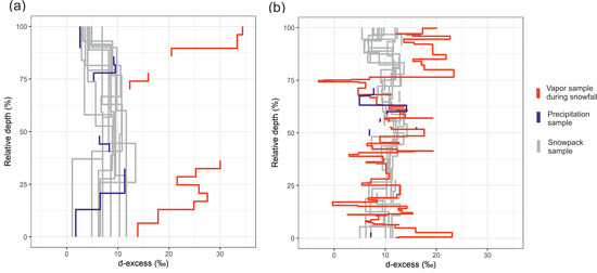 The method for comparing the snowpack, atmospheric water vapor, and precipitation d-excess values presented in Figure 10, is defined in Equation (1). At Imnavait, the range of d-excess values was similar in both precipitation and the snow profile. Only the top layer in the snowpack clearly reflects the d-excess values in the most recent precipitation event on 13 March 2019 (Figure 10a). The d-excess values in the vapor were distinctly offset from both snowpit and precipitation samples, particularly for the most recent event where precipitation and snow d-excess values ranged between 0 and 5‰, and vapor between 30 and 33‰.