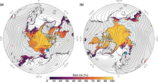 Daily mean climatology composites of the snowfall sampling days at (a) Imnavait and (b) Pallas (blue squares) during the winter 2018–2019 measurement campaign. Contour lines depict mean 850 mb geopotential heights with the dominant low (L) and high (H) pressure centers [89], and the shaded region represents daily mean composited sea ice concentration during the corresponding snowfall sampling days [90]. The dashed blue circle depicts the Arctic Circle at ~66° N. Sampling dates used to construct the composite maps are given in Table A1.