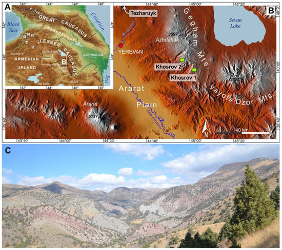 The Republic of Armenia is located in the northeast of the Armenian Highlands, at the border of the Caucasus and western Asia. The study area is located in the Lesser Caucasus mountains belonging to the large and morphologically and geologically diverse Black Sea–Caspian Sea region (Figure 1A). This area is largely determined by its position between the Eurasian and Africa–Arabian lithosphere plates, within a wide collision zone [30,31]. The Lesser Caucasus (max. elev. Aragats, 4090 m a.s.l.) is situated between the Transcaucasus in the north and the Armenian Upland in the south, stretching from the Black Sea to the Araks river valley for a distance of about 600 km. The mountains have fold and fault-block structures consisting of a series of parallel mountain ranges and tectonic depressions. The research sites are located in the central part of the Lesser Caucasus: the Geggham Mountains (max elev. Azhdahak 3997 m a.s.l.) and the Tsaghkunyats Mountains (max elev. Teghenis 2851 m a.s.l.) (Figure 1B). These mountain ranges are built of Tertiary–Quaternary subaerial volcanic rocks, which create a high elevated plateau, lava domes, and cinder cones cut by deep valleys with steep slopes [32,33].