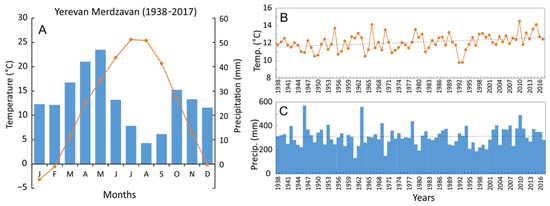 Regional climate diagram of the central Lesser Caucasus Mountains based on Yerevan Merdzavan meteorological station data over 80 years (1938–2017): (A) monthly mean temperature and precipitation, (B) long-term annual mean temperature, and (C) annual precipitation. Dashed lines represent trends in climatic data.