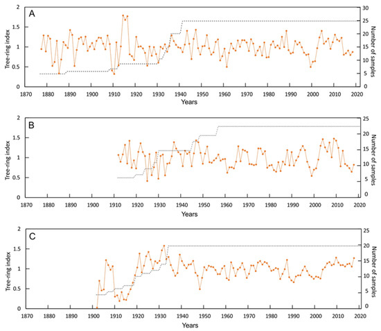 A total of 90 trees (30 trees at each site) were sampled during the fieldwork in 2018. In general, one core was extracted from each tree using a Pressler borer due to the lack of access to the tree trunks. In the cases of distorted and irregular tree trunks, two cores were taken per tree to support cross-dating. Each tree was sampled at a height of 0.8–1.3 m. The sampling strategy was dependent on the shape and density of the branches in the lower part of the tree trunk. In the laboratory, each core was air dried, mounted in a holder, and the surface of the cross-section was cut with a razor blade. Next, all cores were scanned at a resolution of 1200 dpi and the annual ring widths were measured with an accuracy of 0.01 mm using WinDENDRO software. The quality of the dating and measurement was checked by the COFECHA program [47]. To remove nonclimatic trends resulting from age, size, and stand dynamics, the cross-dated raw ring widths were detrended using a negative exponential curve. The detrended individual time series of ring widths were averaged into a standard tree-ring width chronology and indexed using the ARSTAN program [48]. The same procedure was repeated for each sampling site. A reliable period of chronology was defined as a period with more than five samples and EPS (The Expressed Population Signal) above 0.85.