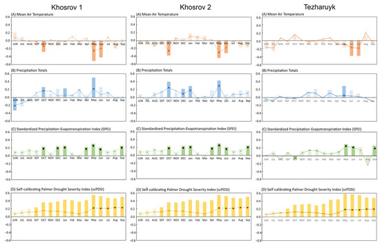 Correlation (bars) and response function (dots) coefficients between the juniper (Khosrov 1 and 2) and oak (Tezharuyk) chronologies and climate variables and drought indexes (A–D) from June of the previous year to September of the current year over the period 1920–2018. Dark bars and dots indicate significance at the 95% level of confidence.