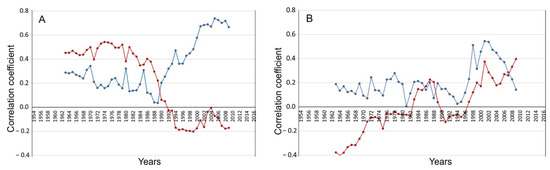 Moving correlation analysis (20-years window) showing influence of annual precipitation (blue line) and temperature (red line) on juniper (Khosrov 1 site) (A) and oak (Tezharuyk site) (B) tree-ring width chronologies.