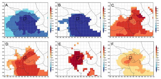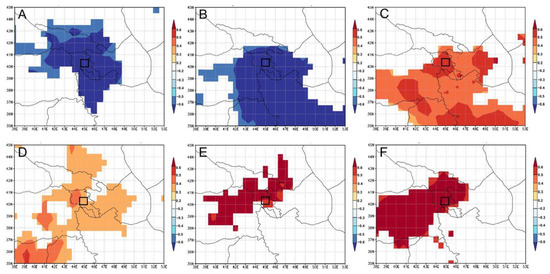 Spatial correlations between the juniper chronology and (A) May gridded mean temperature (CRU TS4.04), (B) May gridded maximum temperature (CRU TS4.04), (C) May gridded precipitation (CRU TS4.04), (D) May cloud cover (CRU TS4.04), (E) July scPDSI (CRU, 3.26e), and (F) May SPEI (CSIC) for the period 1960–2000. Only significant (p < 0.05) correlation is shown.
