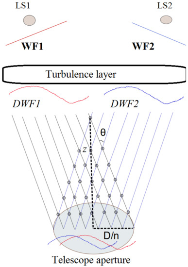 The geometry of crossing light beams from solar light source falling on the telescope aperture in our method is shown in Figure 2. Since the light source is significantly remote, the wavefront at the upper boundary of the atmosphere can be considered as flat. When radiation propagates in the earth’s atmosphere, the wavefront is distorted due to atmospheric turbulence.