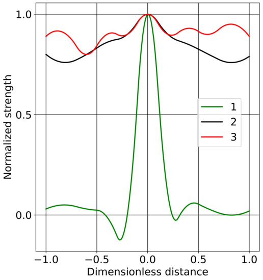 Assume the wavefronts propagate through the turbulent layer. Repeatability probability functions correspond to cm and cm (Figure 6). Light beams are crossing at the height of this turbulent layer. Then, the function estimated from the triangulation of local slopes of the wavefronts has shape shown by green line in Figure 7. Red and black lines correspond to the functions estimated for cm and cm, respectively.