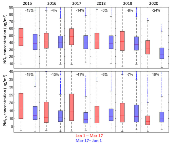 On the other end, concentrations of PM2.5 appeared to have been barely affected by the lockdown and, contrasting with previous years at the same time periods, a 16% increase was observed after the start of lockdown (averaged over 17 March–1 June compared to 1 January–17 March 2020, see bottom right panel of Figure 1). The high interannual variability of PM2.5 concentrations for the first five months of the year (box plot’s length in lower panels of Figure 1) seemed to indicate no significant patterns (reduction or increase) compared to the mean of the five previous years. Meteorological conditions highly influence PM variability in Paris [75].