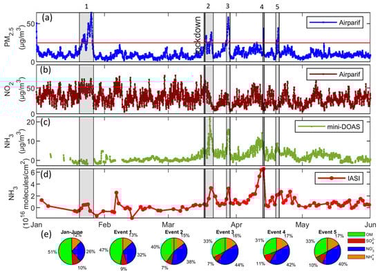 Time series of hourly PM2.5 and NO2 concentrations (µg/m3) derived from the Airparif network (a,b), hourly NH3 concentrations (µg/m3) derived from the mini-DOAS (c), daily Infrared Atmospheric Sounding Interferometer (IASI) NH3 total column (molecules/cm2) measured in a 50 km radius circle from Paris city center (d), and mean relative contributions of major PM1 chemical species (OM: organic matter, SO42−: sulfate, NO3−: nitrate, and NH4+: ammonium) measured at SIRTA from January to June 2020, and for the 5 investigated periods (e).
