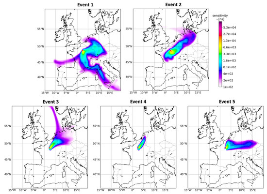 Complex equilibrium between contributions of long-range transport, local emission and dispersion, and chemical transformations in the atmosphere control the air quality in megacities [76] such as Greater Paris. To attribute the transport input to pollution episodes detected over Paris in winter and spring 2020, the FLEXPART Lagrangian particle dispersion model was used. Figure 3 shows the sensitivity (i.e., influence) to various regions for air parcels reaching the Paris region during the five pollution episodes.
