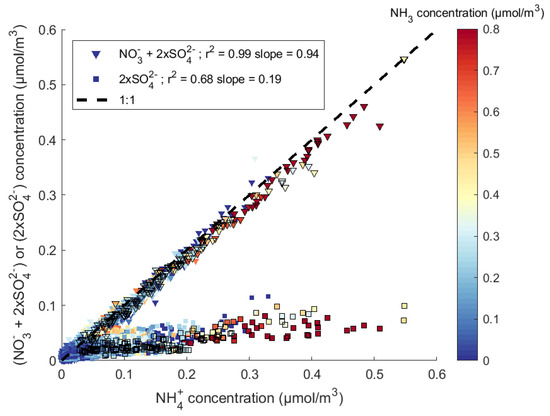 Molar concentrations of 2xSO42− + NO3− (triangles) and 2xSO42− (squares) versus NH4+, color coded by NH3 molar concentrations measured in Paris from January to June 2020. Concentrations measured during the five pollution events are represented with black marker edges.