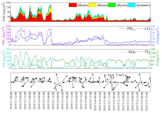 Figure 1 shows the time series of observed VOCs, PM2.5, CO, NOx, O3, and meteorological parameters (wind speed and wind direction) from 1 March 2019 to 15 March 2019. During the whole observation period, the variation in VOCs was consistent with the variations in PM2.5, CO, and NOx, which indicated that the main sources for these pollutants were similar and their change was mainly influenced by the meteorological conditions. Two haze events were observed from 1 March 2019 to 5 March 2019 and from 8 March 2019 to 10 March 2019. During the two haze events, the maximum hourly concentrations of PM2.5 were 263.58 and 156.34 μg/m3, respectively, and the average hourly concentrations were 142.96 and 95.33 μg/m3, respectively, which were 7–12 times higher than the average concentrations during non-haze days (12.39 μg/m3). The maximum hourly concentrations of VOCs were 148.53 and 103.56 μg/m3, respectively, and the average hourly concentrations were 63.37 and 55.47 μg/m3, respectively, which were 3–4 times higher than the average concentrations during non-haze days (16.91 μg/m3). The average concentrations of CO during different haze events were 1.74 and 1.55 mg/m3, respectively, which were evidently higher than those during non-haze days (0.82 mg/m3). The average concentrations of NOx were 88.71 and 108.34 μg/m3, respectively, which were significantly higher than that of 28.01 μg/m3 during non-haze days. The peak values of NOx usually occurred at around 02:00, and the diesel vehicles are only permitted to drive on the Fifth Ring Road after 0:00 at night, and thus diesel exhaust was one of the main sources of local NOx. Figure 1 shows that wind speeds were lower during the two haze events, and the average wind speeds were 2.00 and 1.88 m/s, respectively, whereas the average wind speed was 3.40 m/s during non-haze days. Wind speed could influence the dilution and diffusion of pollutants. The much lower wind speeds were one of the important factors for the accumulation of pollutants during haze events.