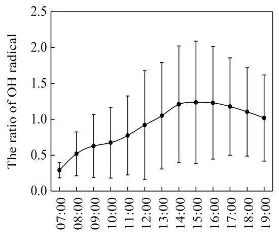 According to Equation (3), the ratio of OH radical concentration during haze days and non-haze days was determined using Equation (4):