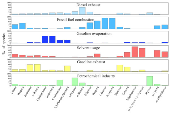 Six factors were identified during the observation period. These factors were identified as diesel exhaust, combustion, gasoline evaporation, solvent usage, gasoline exhaust, and the petrochemical industry (Figure 3). Factor 1 explained 9.93% of the contribution (Figure 3) and had high loadings of n-nonane (60.35%), n-heptane (25.92%), and 2,3-dimethylpentane (13.22%). The percentages of C3-C5 alkanes, such as propane (8.29%), n-butane (9.50%), and isopentane (16.46%), occupied certain proportions. Benzene, toluene, ethylbenzene, m-xylene + p-xylene, and o-xylene (BTEX) were also evident. Heavy hydrocarbons above C8 are considered as the exhaust gas emission marker of diesel engines [24,36,48]. n-butane is a marker of vehicle exhaust emissions [38,39]. Therefore, Factor 1 was responsible for the diesel exhaust emissions. Factor 2 explained 25.29% of the contribution (Figure 3) and had high loadings of 1-butene (90.47%), acetylene (88.60%), ethylene (51.98%), and ethane (36.28%). Propane, benzene, and toluene were evident in certain proportions. Acetylene,1-butene, and ethylene are tracers of combustion sources [35,36,37,41]. Propane and ethane are markers of natural gas emissions [35,36,37]. Therefore, Factor 2 was responsible for the fossil fuel combustion sources. Factor 3 explained 3.90% of the contribution (Figure 3) and had high loadings of C4–C7 alkanes, especially isopentane (58.00%), cyclopentane (58.81%), and cyclohexane (23.40%). Furthermore, 2,3-dimethylpentane and n-butane were evident in certain proportions. Isopentane is a typical tracer of volatile gasoline [23,49], 2,3-dimethylpentane is a tracer emitted by the oil industry [36,42], and n-butane is a vehicle exhaust emission marker [38,39]. Therefore, Factor 3 was responsible for the source of gasoline evaporation. Factor 4 explained 16.88% of the contribution (Figure 3) and had high loadings of ethylbenzene (89.74%), m-xylene + p-xylene (75.54%), o-xylene (58.52%), toluene (41.64%), and m-ethyltoluene (47.52%). Ethylbenzene, m-xylene + p-xylene, and o-xylene mainly come from the use of paints, synthetic spices, adhesives, and cleaning agents [23,36,40]. M-ethyltoluene is produced during the coating process in the metal surface treatment industry [41]. Toluene as a solvent is used in furniture, footwear, adhesives, printing, and other industries [36]. Therefore, Factor 4 was responsible for the source of solvent usage. Factor 5 explained 35.59% of the contribution (Figure 3) and had high loadings of C2–C7 alkanes, such as ethane (17.23%), propane (18.73%), isobutane (58.61%), n-butane (60.34%) (vehicle exhaust emissions marker), and 2,3-dimethylpentane (47.94%). Ethylene and BTEX were found. Therefore, Factor 5 was responsible for gasoline exhaust emissions. Factor 6 explained 8.41% of the contribution (Figure 3) and had high loadings of styrene (79.30%), n-heptane (66.72%), cyclohexane (49.02%), and n-nonane (24.67%). Cyclohexane is widely used by chemical companies that produce adipic acid and caprolactam [9,50]. N-nonane, n-decane, and n-undecane are important indicators of diesel vehicle exhaust [36,43,44], but may also be released from asphalt and supplied as the raw materials for various oil refining processes [9,50]. Therefore, Factor 6 was responsible for the petrochemical industry.