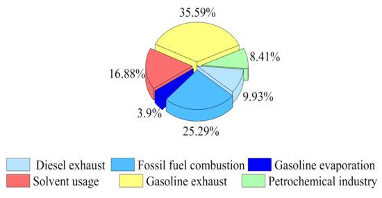 During the whole observation period (Figure 4), the results suggest that the vehicle exhaust emission sources (gasoline exhaust 35.59%, diesel exhaust 9.93%) were the largest contributor, accounting for 45.52% of the total VOCs. The fossil fuel combustion sources contributed 25.29%. This may be related to the use of coal for heating in northern China. Solvent usage and the petrochemical industry accounted for 16.88% and 8.41% of the total VOCs, respectively. The contribution of gasoline evaporation was the lowest, and was 3.90%.