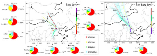 Backward trajectory cluster analysis was used to reveal the transport pathways of air masses. Figure 6 shows the 24 h backward trajectories from CRAES during haze and non-haze days. The dominant air masses of CRAES and the proportion of VOC species of each air mass trajectory during haze and non-haze days were observed. The air mass of VOCs during haze days was mainly affected by the short-distance transportation from the southwest of Hebei province (35.8%) and the local area centered in Beijing (22.5%), which were the most important pollution trajectories. However, the air mass of VOCs during non-haze days was mainly affected by long-distance transport. The long-distance air masses of the non-haze days came from the northwest, accounting for 53.3% and 34.2%, respectively. Regardless of the distinction between haze and non-haze days, other air masses of trajectories have a relatively small proportion. Regarding the proportion of VOCs in each air mass trajectory, it could be seen that alkanes contributed more than half of all air masses. However, the contributions of alkenes were larger than those of aromatics in northwest transport pathways during haze days, whereas the contributions of aromatics were larger than those of alkenes in southwest transport pathways during haze days and in all transport pathways during non-haze days. Overall, the main influences were the short-distance transport of air masses during haze days and the long-distance transport of air masses during non-haze days, which had more alkenes than aromatics.