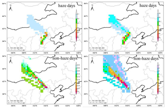 The potential source contribution function (PSCF) (left) and concentration weighted trajectory (CWT) (right) from CRAES during haze days and non-haze days.