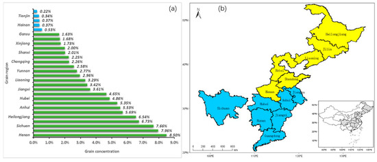Distribution of annual average grain concentration (a) and main grain-producing areas in China (b). (a) Green bars indicate that the grain concentration is more than 1.0%, and blue bars indicate that the grain concentration is less than 1.0% [40]. (b) The light yellow areas belong to the North region, and the blue areas belong to the South region.