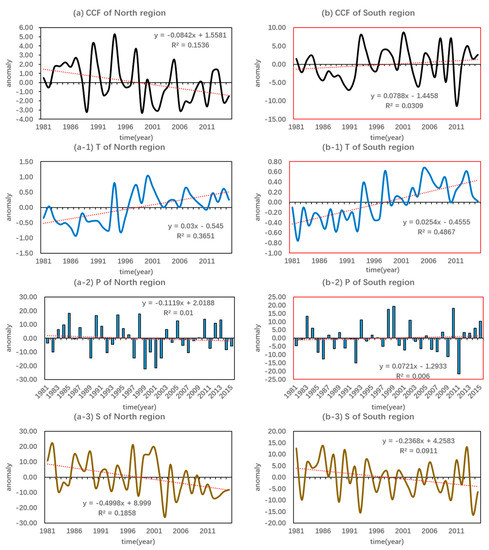 Anomalous variations of different climatic factors in the North and South regions during the growing season from 1981 to 2015. CCF is the comprehensive climate factor, T is the mean temperature, and P is the precipitation, S is the sunshine hours. The red dashed line is a linear trend line.