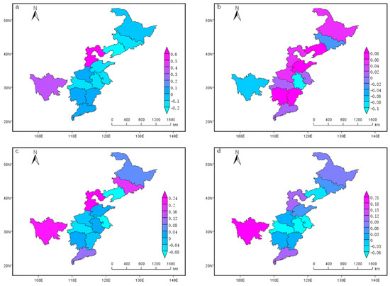 As mentioned above, there were obvious regional differences in the sensitivities of the three main crop yields to climate change in the North and South regions. To further understand the spatial distribution of sensitivities and explore the sensitive zoning of crop yields affected by climate change, provincial administrative regions were taken as the research unit, and the climate output elasticities of 13 provinces in China’s main grain-producing areas were simulated using the C-D-C model. There were obvious differences in the spatial distribution of the climate output elasticity of the three main crop yields (Figure 3).