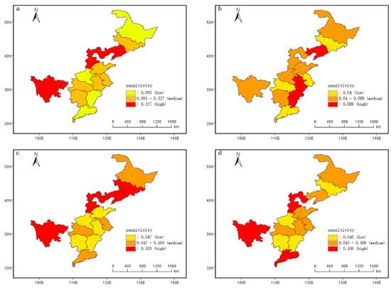 For different crops, there were obvious differences in the sensitivity of crop yields to climate change in different regions. High-sensitivity regions for rice yield per unit area included Liaoning Hebei and Sichuan provinces; medium-sensitivity regions included Jilin, Shandong, Anhui, Jiangsu, Hubei and Hunan provinces; low-sensitivity regions included Heilongjiang, Henan, Jiangxi and Guangdong provinces (Figure 4a). The high-sensitivity regions for wheat yield per unit area were Liaoning, Jiangsu and Jiangxi provinces; medium-sensitivity regions were Heilongjiang, Hebei, Shandong, Henan, Hunan and Sichuan provinces; low-sensitivity regions were Jilin, Anhui, Hubei and Guangdong provinces (Figure 4b). The high-sensitivity regions for maize yield per unit area were Jilin, Liaoning, Hebei and Sichuan provinces; medium-sensitivity regions were Heilongjiang, Anhui, Hunan and Guangdong provinces; low-sensitivity regions were Shandong, Henan, Jiangsu, Jiangxi and Hunan provinces (Figure 4c). The high-sensitivity regions of grain yield per unit area were Hebei, Guangdong and Sichuan provinces; medium-sensitivity regions were Heilongjiang, Liaoning, Shandong, Anhui, Jiangsu and Hubei provinces; low-sensitivity regions were Jilin, Henan, Hunan and Jiangxi provinces (Figure 4d).