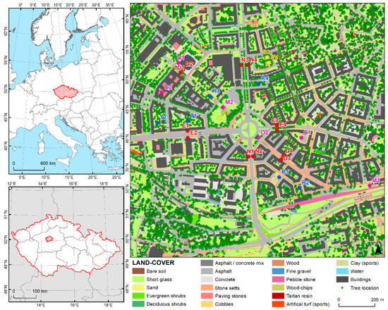 For a better understanding of the spatiotemporal pattern of thermal exposure, it is worth considering the map of land-cover categories for Prague-Dejvice classified to PIDS classes and with marked tree positions (see Figure 1).