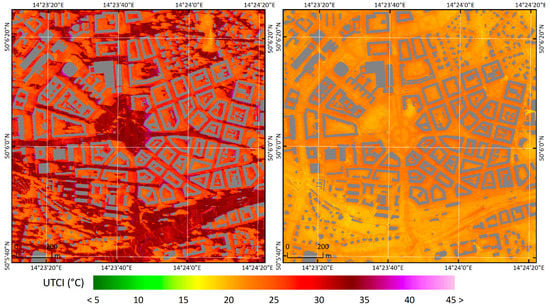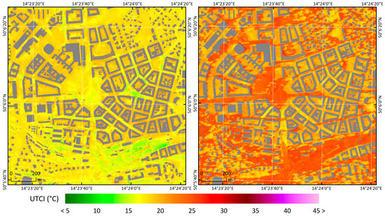Spatial variability of universal thermal comfort index (UTCI) in Prague-Dejvice on 20 July 2018 at 08:30 (left) and 12:30 (right) UTC: the MRT values for the same times appear in Figure A8 in Appendix C. The land-cover categories in Prague-Dejvice, classified by the PIDS classes with tree positions, may be found in Figure 1.