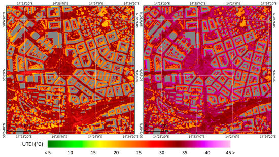 The highest daily averages of UTCI values are reached during the “afternoon” phase of the spatial thermal exposure pattern, which begins between 10 and 11 UTC (+02:00 CEST). It is noticeable that the UTCI peaks occur approximately 2–3 h earlier than peaks in air temperature. At this stage, up to 70% of the area experiences strong heat stress (see Figure A9 in Appendix D). Such high UTCI values reflect the daily maximum of MRT values as a consequence of high surface temperature and its associated emission of long-wave radiation, combined with high values of short-wave radiation remaining from direct sunlight. The maximum UTCI values shift from south-facing to southwest-facing walls on buildings within directly irradiated areas, where in some cases, very strong heat stress is predicted (Figure 3, right). However, a strongly developing turbulent flow results in increased spatiotemporal variability of the UTCI pattern. The values within individual courtyards vary widely depending on the quantity and location of their vegetation. Areas of relatively lower UTCI values in the shade of vegetation are clearly evident during the afternoon phase. The lowest UTCI values may be observed on land with larger, compact groups of abundant trees with high, thick crowns (gardens and parks).