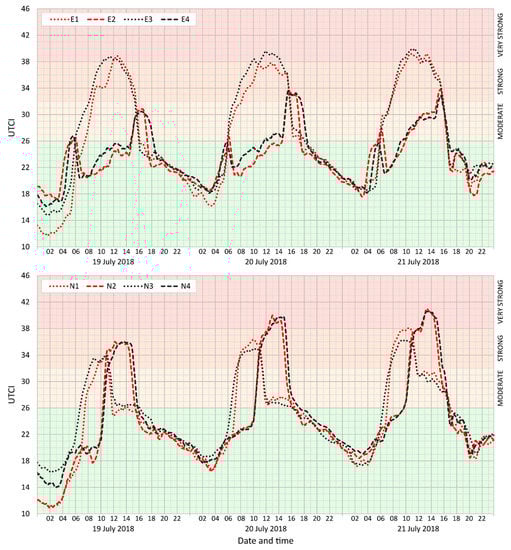 Moving averages (n = 5) of the UTCI index in selected street-canyon locations (the E points are located in streets running east-to-west, the even numbers are from southern locations, and the odd numbers are from northern locations; N indicates a north–south canyon, the even numbers are eastern locations, and the odd numbers are western locations): the MRT values for the same times appear in Figure A2 in Appendix B.