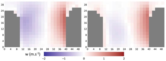 Ten minute averages of the vertical wind component proving the modification of thermodynamics in an urban canyon (w, positive = upwards) between points E3 and E4 in an east-to-west canyon at 10:00 (left) and 13:30 (right) UTC on 20 July 2018: the view runs east to west (the buildings are grey, while the one on the right has a south-facing wall). Axis units are expressed in meters.
