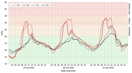 Four representative points were selected: two in courtyards with dense trees (T1 and T2) and the other two in largely paved courtyards with little vegetation (C1 and C2). The results for the daytime show that the UTCI values in the courtyards with trees were 5–10 °C lower than those in the paved courtyards. The trees mitigate spells of moderate heat stress substantially, thus avoiding the occurrence of strong heat stress (Figure 7). Maximum UTCI values occurred in the afternoons. However, this tendency may alter with respect to the irradiance of the courtyard. Small and closed courtyards are usually shaded by neighborhood buildings, and insolation is usually lower as a result. Interestingly, during the first part of the night, the UTCI values remained slightly higher in paved courtyards, a response to higher surface temperatures arising out of heat accumulation in the grounds and walls of buildings. Higher levels of long-wave radiation emitted by the tree crowns in comparison with the radiation from the sky contribute to higher MRT and consequently to higher UTCI values in the course of night in a similar fashion to the situation in street canyons (see Section 5.2.1). During the second part of the night, the UTCI differences between paved courtyards and green courtyards with trees vanish, while phases of higher UTCI values in courtyards with trees may appear. Nevertheless, in all cases, UTCI values during the night remain substantially below the level of thermal stress (Figure 7).
