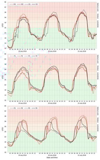 Moving averages (n = 5) of UTCI in selected locations: open areas, often with public markets (M1–2) and beer gardens (O1–2), open grass surfaces (P1–2) and children’s playgrounds (P3 is on sand, and P4 is on artificial grass), and “piazzettas” (densely planted squares in built-up areas) (R1–4). The MRT values for the same times appear in Figure A4, Figure A5 and Figure A6 in Appendix B.