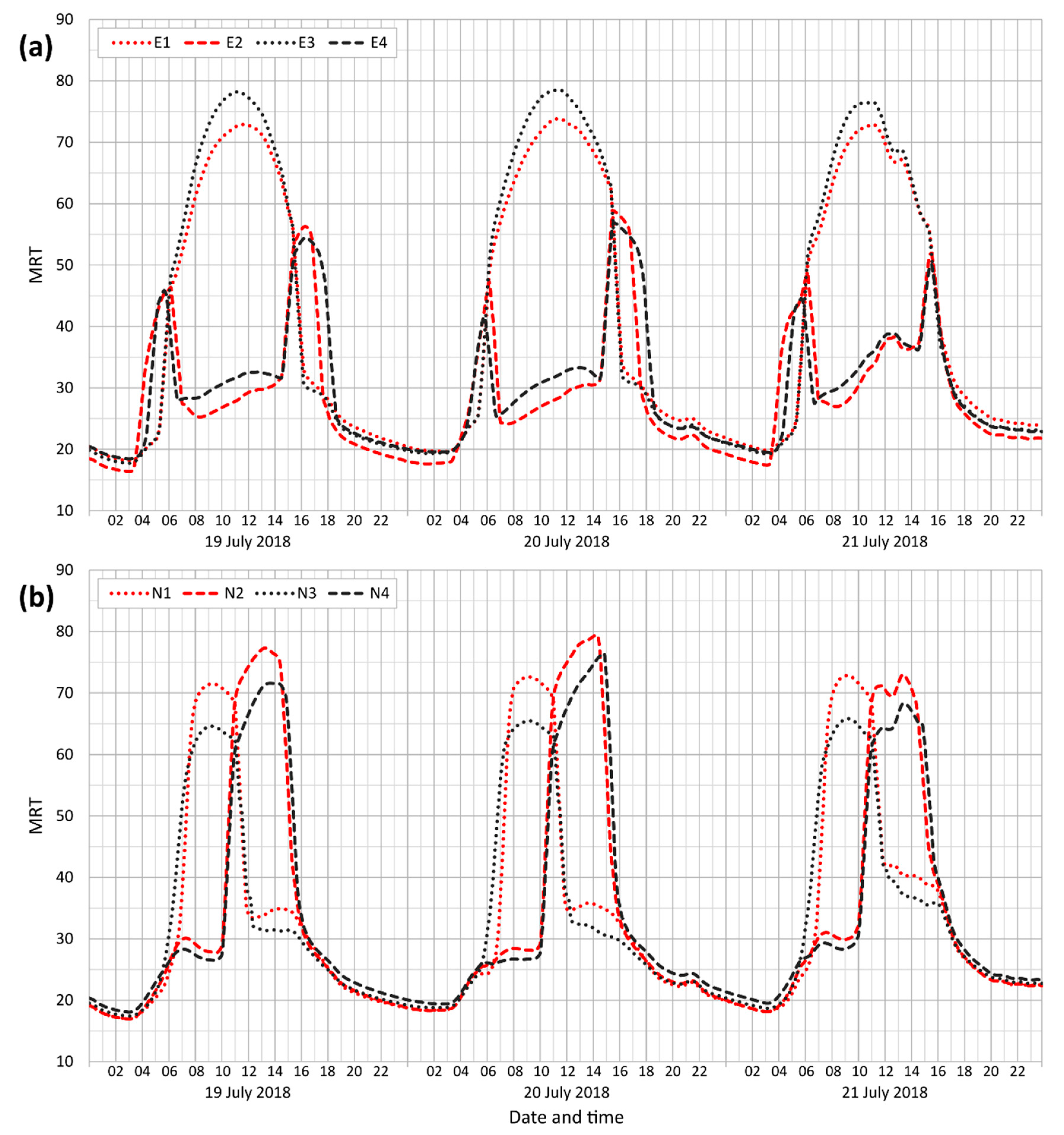Moving averages (n = 5) of the MRT index in selected street-canyon locations (E points (a) are located in east-to-west streets, the even numbers represent southern locations, and the odd numbers are northern locations; N (b) represents the north–south canyons, the even numbers represent eastern locations, and the odd numbers are western locations).