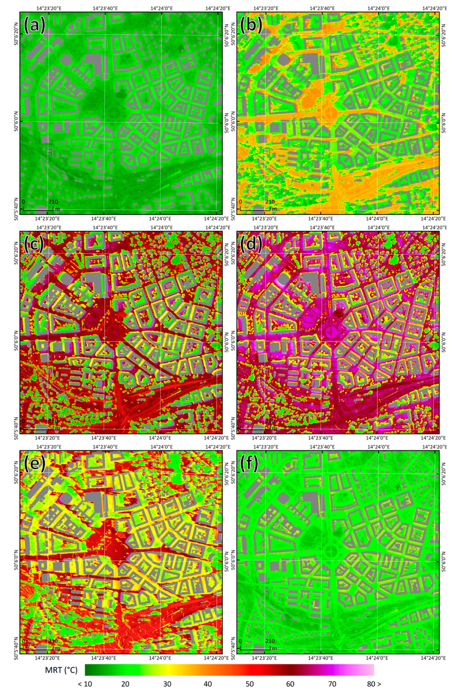 Spatial variability of the mean radiant temperature (MRT) in Prague-Dejvice on 20 July 2018 at 02:00 (a), 05:30 (b), 08:30 (c), 12:30 (d), 16:30 (e), and 20:30 (f) UTCI.