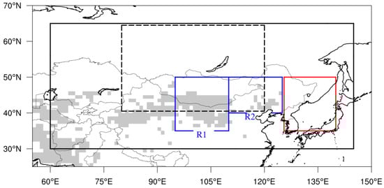 Research domain in this study. The black solid line represents the area for calculating the SHPI. The black dashed line represents the area for calculating the SHI. The two blue solid lines (R1 and R2) denote dust source regions. The red box is the ETC domain. The grey shaded area denotes the dust area. We used the fractional dust source inventory data of 1° × 1° resolution from https://www.gfdl.noaa.gov/atmospheric-physics-and-chemistry_data/ [69].