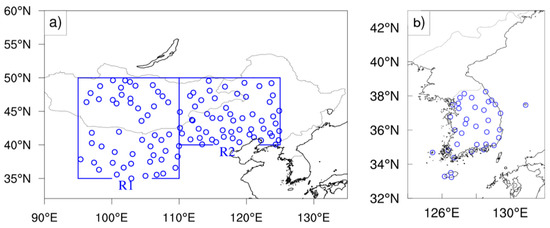 Locations of the SYNOP for calculating dust frequency; (a) 106 stations in the dust source regions and (b) 36 stations in South Korea.