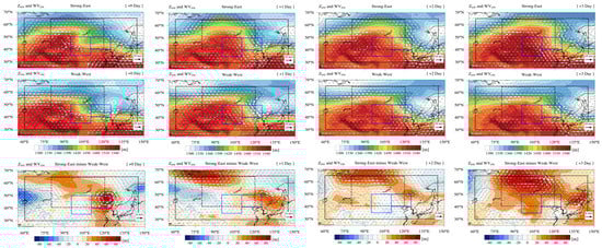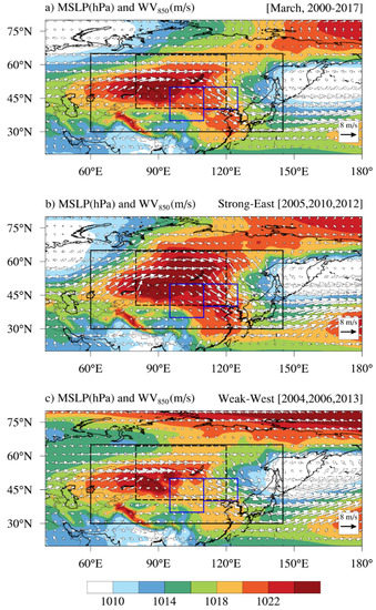 Composite maps of MSLP (shaded; unit: hPa) and WV850 (white arrows; unit: m s−1) for March in (a) 2000–2017, and (b) the Strong-East (average of 2005, 2010, 2012) and (c) Weak-West (average of 2004, 2006, 2013) periods. The arrow in the lower right corner denotes wind speed of 8 m s−1. Contour interval is at 2 hPa. Boxes are the same as shown in Figure 1.