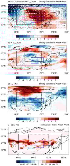 Composite differences in meteorological variables between the Strong-East and Weak-West periods. (a) MSLP (shaded; hPa) and WV850 (white arrows; m s−1), (b) WS850 (shaded; m s−1), (c) Tsfc (shaded; °C), and (d) SCE (shaded; %). Boxes are the same as shown in Figure 1. Black dotted areas (yellow dots in Figure 5d) indicate the differences are statistically significant above the 90% confidence level based on the Student’s t-test.