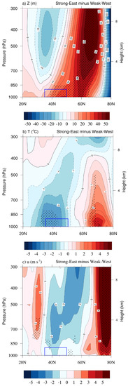 To explain the linkage between cyclones and dust activity associated with the SH variations, we analyzed the characteristics of the extratropical cyclones (ETC) in the dust source regions and the ETC domain (125°–140° E, 35°–50° N), i.e., the area over which ETCs pass, as defined by Lee et al. [49] (red box in Figure 1). We compared differences in the ETC frequency and intense ETC frequency over the dust source regions and the ETC domain for the Strong-East and Weak-West periods).