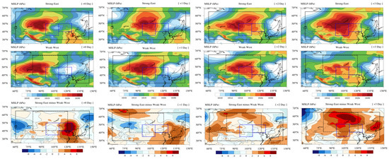 Four-day evolution of MSLP (hPa) averaged over 12 high-dust days for the Strong-East (top panel), Weak-West (middle panel), and difference between Strong-East and Weak-West periods (bottom panel). +0 Day is the day on which dust emitted in the merged region of R1 and R2. Black dotted areas indicate where the differences are statistically significant above the 90% confidence level based on the Student’s t-test.