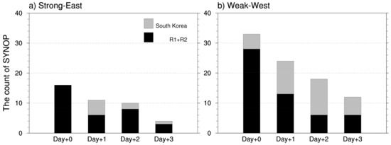 To better understand the dust incursion process into South Korea, we also performed a case study by selecting twelve days when high dust events occurred over the combined R1 and R2 region. We analyzed the composite difference in meteorological patterns and counts of dust-observing SYNOP for three consecutive days (Day + 1, Day + 2, Day + 3) after the start of dust emission day (Day + 0) between the Strong–East and Weak-West periods. We selected twelve days of high dust days for each Strong–East and Weak-West period (Table S4). Then we averaged twelve cases of meteorological variables and counts of SYNOP for each Day + n.