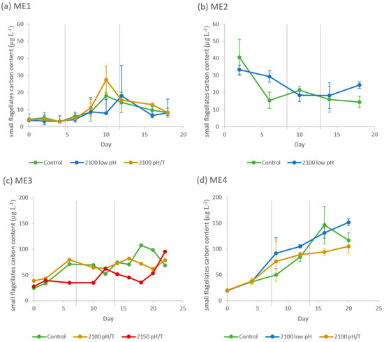 Small flagellates carbon content (µg L−1) during (a) ME1, (b) ME2, (c) ME3 & (d) ME4. The average of the 3 treatment replicates are plotted against time with standard deviation as error bars. There is no error bar for ME3 as there were only 2 replicates per treatment from day 6. Note the different vertical scales.